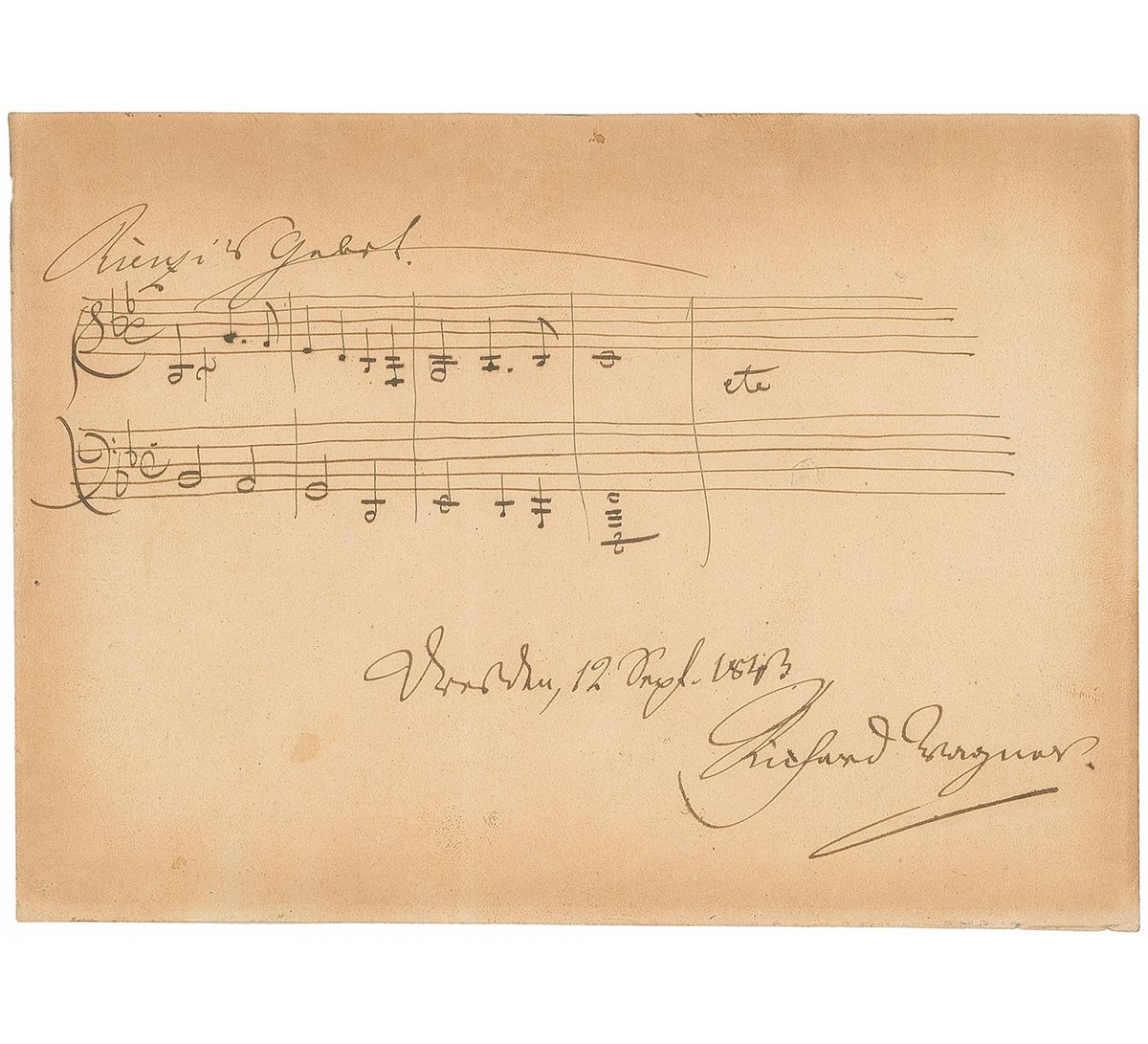Extraordinary AMQS on an off-white 7 x 5 sheet, crisply signed at the conclusion, “Dresden, 12 Sept. 1843, Richard Wagner.” Wagner pens four bars from ‘Rienzi's Prayer,’ which opened act five of his early opera titled Rienzi, der Letzte der Tribunen. In fine condition, with toning to edges. Wagner wrote the opera between 1838 and 1840, and it was first performed in Dresden on October 20, 1842. Although he grew to dislike the work, it represented his first major success and its popular reception proved a crucial turning point in his career. A rare and extremely desirable early piece.