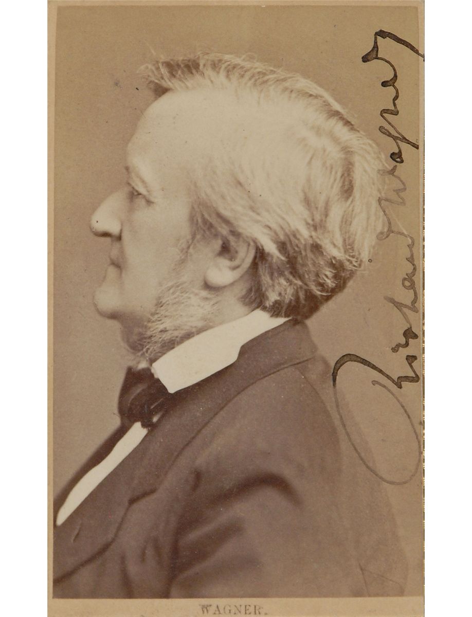Magnificent 2.25 x 3.75 carte-de-visite portrait of the composer in profile, signed vertically on the right side in bold black ink, “Richard Wagner.” This image was captured during an 1877 sitting with Elliott & Fry in London. Affixed to an attractive gold brocade background and presented in an Art Nouveau frame to an overall size of 5.25 x 8. In fine condition. During this period of his life, Wagner was beginning to seriously work on his last completed opera, Parsifal, which he had conceived two decades earlier while contemplating the 13th-century epic poem that tells the story of the Arthurian knight Percival and his quest for the Holy Grail. The opera would premiere at the Bayreuth Festival five years later in 1882, one year before his death. A superlative example of one of the most sought-after musical autographs.