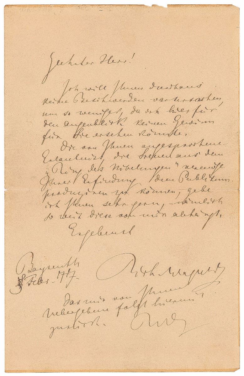 ALS in German, signed “Rich. Wagner,” one page, 5.5 x 8.25, February 5, 1877. Letter to a gentleman. In full (translated): "I certainly don’t want to cause you any problems, all the less so because for the time being I could not see any advantage for you here. The permission you mentioned, to be able to produce the scenes from The Ring of the Nibelung for the public by means of your invention, I gladly grant, insofar as this depends on me.” He adds a short postscript, initialed “RW,” in full: “I am returning the material you sent me herewith.” In very good condition, with a partial separation to the central horizontal mailing fold, scattered creases, and a couple small chips and tears to toned edges.