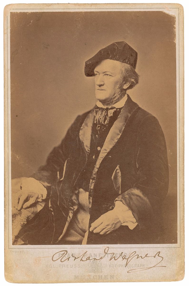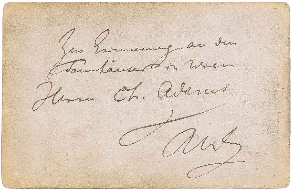 Uncommon and extremely desirable 4.25 x 6.5 cabinet photo of Wagner in elaborate formal attire circa 1870, signed in the lower border in ink, and additionally initialed and inscribed on the reverse, “To Mr. Charles Adams in remembrance of the Tannhauser performance in Vienna.” Published by Franz Hanfstaengl of Munich. Some surface marks and a chipped corner of the albumen image, soiling to edges, and photographer’s information faded but legible, otherwise fine condition; overall a very visually appealing piece. This photo was taken in 1870, marking the premiere of Wagner’s classic opera The Valkyrie, the second in his cycle of four operas inspired by Norse mythology. The inscription on the reverse also marks an important event, the Vienna premiere of his masterful opera Tannhauser in 1875. An uncommon format and wonderful pose of the famed composer, with links to two of his most beloved works.