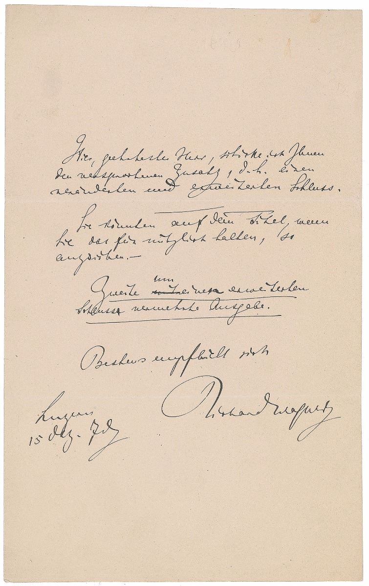 ALS in German, one page, 5.25 x 8.5, December 15, 1870. Letter to his publisher Schott & Co. In full (translated): “Here I send you the addition I promised, i.e. a changed and expanded finale. If you consider it useful you could indicate accordingly on the title page—Second Edition with an Expanded Finale.” In fine condition. Wagner had married Cosima in Lucerne on August 25, 1870, and on Christmas morning—exactly ten days after writing this letter—famously presented her with the Siegfried Idyll.