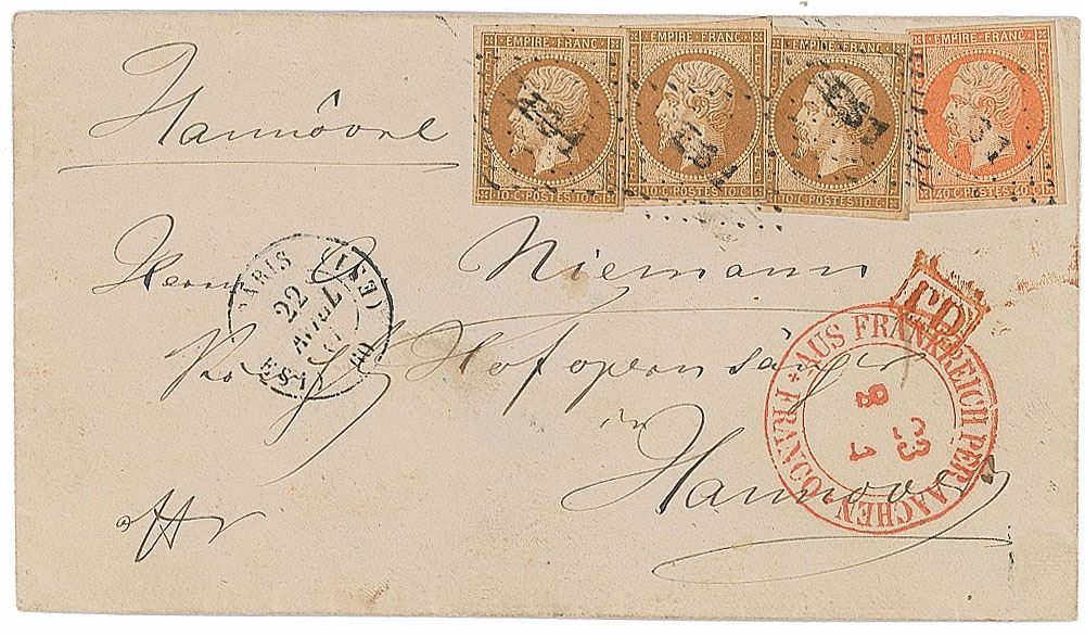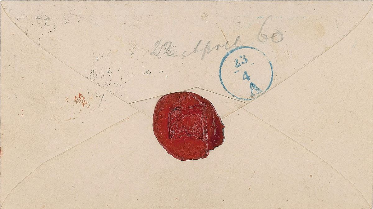 Hand-addressed mailing envelope, 5.5 x 3, addressed in Wagner’s hand to opera singer Albert Niemann at the Royal Court in Hanover, postmarked April 22, 1860. Reverse bears the original red wax seal clearly impressed with Wagner’s initials, “RW.” In fine condition. Niemann starred in the Paris version of Tannhauser in 1861. Accompanied by a libretto of Lohengrin signed by sopranos Eleanor Steber and Astrid Varnay; a blank envelope bearing an embossed portrait of Wagner; and a letter from an unidentified scholar concerning Wagner’s Lohengrin.