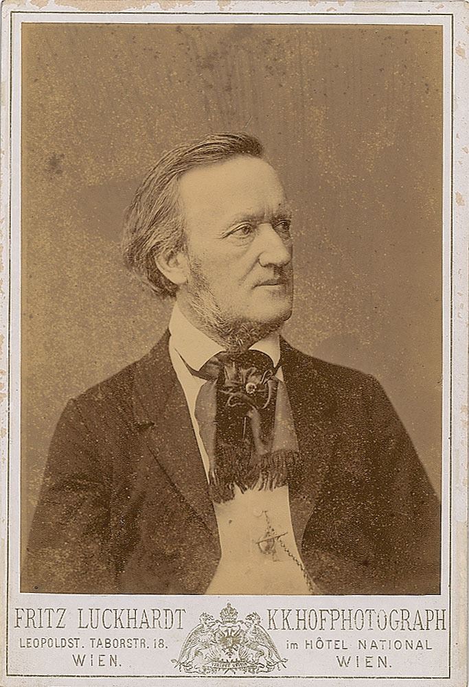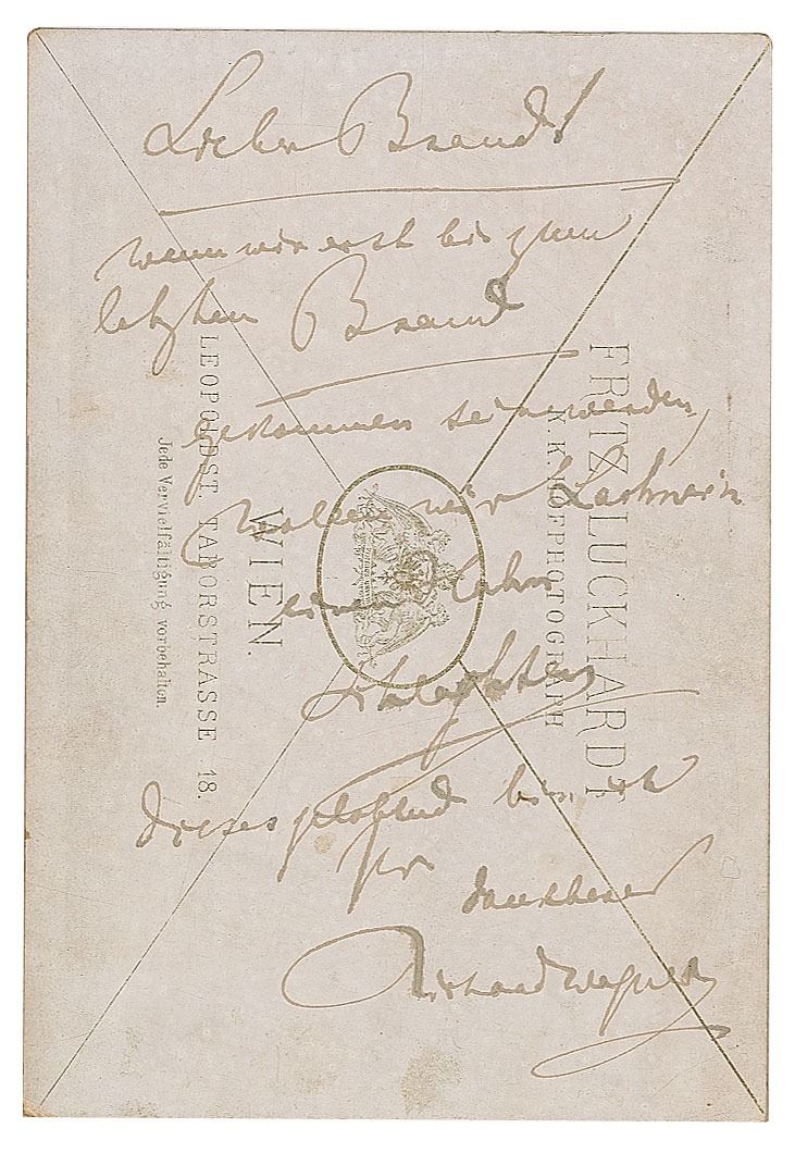 Exquisite 4.5 x 6.5 cabinet photo of Wagner by Fritz Luckhardt, signed and inscribed on the reverse to Carl Brandt, a close collaborator of Wagner at Bayreuth, in ink, "Dear Brandt, when we have come to the last fire, we want to slaughter Lachnerin, a rooster, this I am praising, your thankful Richard Wagner.” In fine condition, with minor surface loss along the front top edge and some speckling to the image.