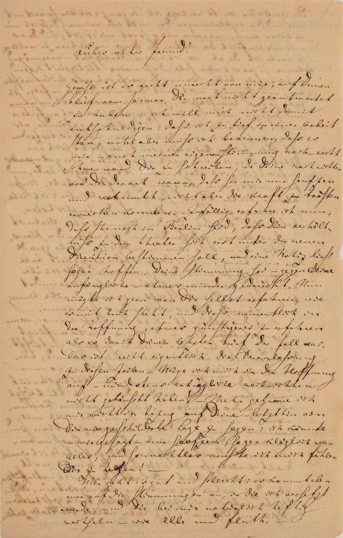 Where money is concerned, what happens with me is that always, when I’m flat broke and Minna is already starting to give me black looks, that’s exactly when something comes in again. This is the reason: I have few friends, but those few love me. Whoever from among them simply can help me always does. The most active in this is Mrs. Ritter in Dresden; Liszt also does his part now and then. I live in complete communism, that is, however, only with those who know me completely and are sincerely devoted to me. I would never take a penny from anyone else; Brockhaus money, for example, I once sent right back. So—understand me well—only someone who esteems and loves me is allowed to support me. Now and then I also have a bit of income. This winter I wrote a quite thick book, 'Opera and Drama.' J. J. Weber wanted to pay 100 thalers; Avenarius offered 75 thalers more after the sale of 400 copies.—It will come out shortly with the latter. About Lohengrin you’ve probably heard and, namely, read something again recently?—Breitfkopf and Härtel are engraving the piano version now, then maybe even the full score as well. It doesn’t require money, just getting rid of a damned old debt to this firm. So you see—I’m even paying debts: what more do you want?—Over the winter here I tutored a mixed amateur and professional orchestra in a few Beethoven symphonies; that has made a stir; now people are talking about engaging a good standing orchestra for my benefit.—I couldn’t get involved with the theater, but a pamphlet of mine is coming out here soon with the title 'A Theater in Zürich'—in which I open people’s eyes a bit and show them what they should do if they want to have something proper. You should get the pamphlet soon.—In May now I’m going to turn to composing my Siegfried. For a change of pace, I’ll go up into the Alps once.—Ah, if only no one ever again wanted to feel sorry for me about the loss of my position in Dresden! How little they know me who see this loss as a misfortune for me! If I were granted amnesty today—even if I were to become senior court music director [Oberhofkapellmeister] in Dresden again—you should see with what calmness of spirit I would stay sitting in my Switzerland and maybe even scarcely set foot on the German empire’s blessed soil!—See, this is how things are with me! Minna sometimes puts on quite a long face, but she also likes being here very much, and in truth, I don’t see why she shouldn’t like it. If she would yield to me more, it would in any case be even better for her.—So I’m giving you good news about me; it’s all the more easy for me to pass over my gloomy days in silence with you, since they mostly just come about as the consequence of overwork and nervous exhaustion, when I then see the wretchedness of our circumstances, at any rate in the light of hopelessness. But isn’t someone happy enough if he overcomes this state of mind now and then?—So now make an effort on your part also to write me something good about yourself, and may your Wilhelm serve you as a topic, your living, vigorous work, who is truly better than my paper works!" In fine condition. Accompanied by a complete translation.