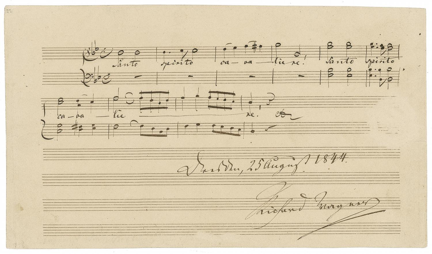 Early AMQS penned and signed on an off-white 8.25 x 10.5 page of musically-lined paper, dated Dresden, August 25, 1844: ten bars from Act III (including the battle hymn) of the opera Rienzi, the composer’s first success. Subtle scattered wrinkling, light soiling, and a circular area of surface loss near the right edge, otherwise fine condition. Rare in that Wagner disliked granting requests for musical quotations.