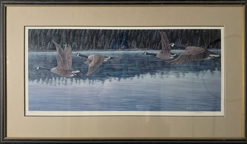 Richard Warnock's "Geese in Flight" limited edition print, signed lower right, and numbered 125/350 lower left. This piece is of four Canadian geese flying low, over a body a water. This piece has been professionally double matted with acid free matting, and has been custom framed under glass.