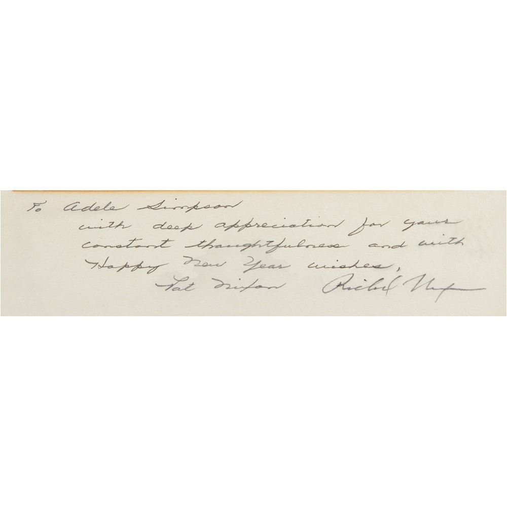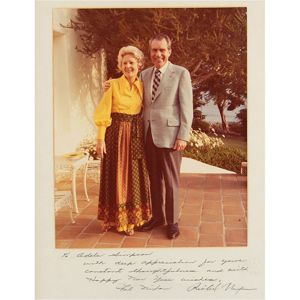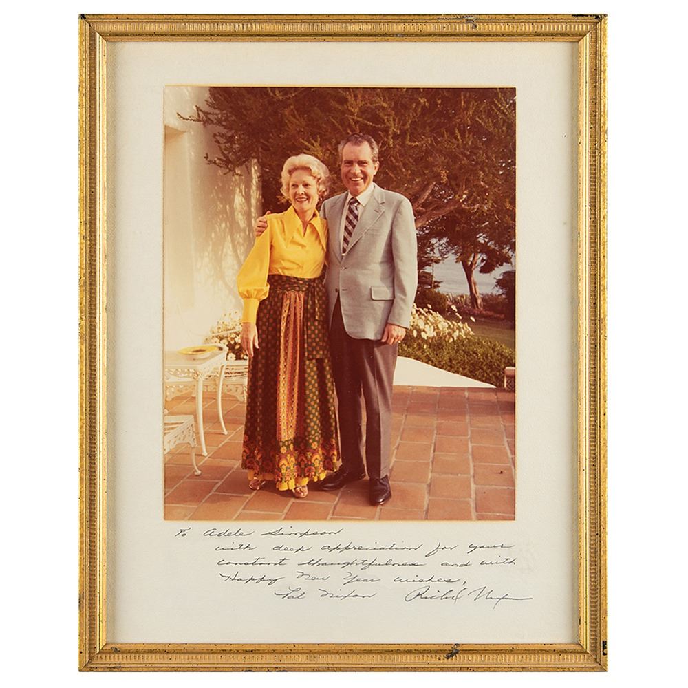 Color vintage satin-finish 8 x 10 full-length photo of the Nixons in their later years, affixed to its original 10.75 x 13.75 mount, signed and inscribed on the mount in black felt tip to noted fashion designer Adele Simpson, "To Adele Simpson, with deep appreciation for your constant thoughtfulness and with Happy New Year wishes, Pat Nixon" and "Richard Nixon.†Framed and in very good to fine condition, with faint dampstaining to the bottom of the mount touching, but not adversely affecting, the signatures. Fashion designers Adele Simpson and her daughter, Joan Raines, designed clothes for several first ladies, including Mamie Eisenhower, Lady Bird Johnson, Pat Nixon, Rosalynn Carter, and Barbara Bush.
