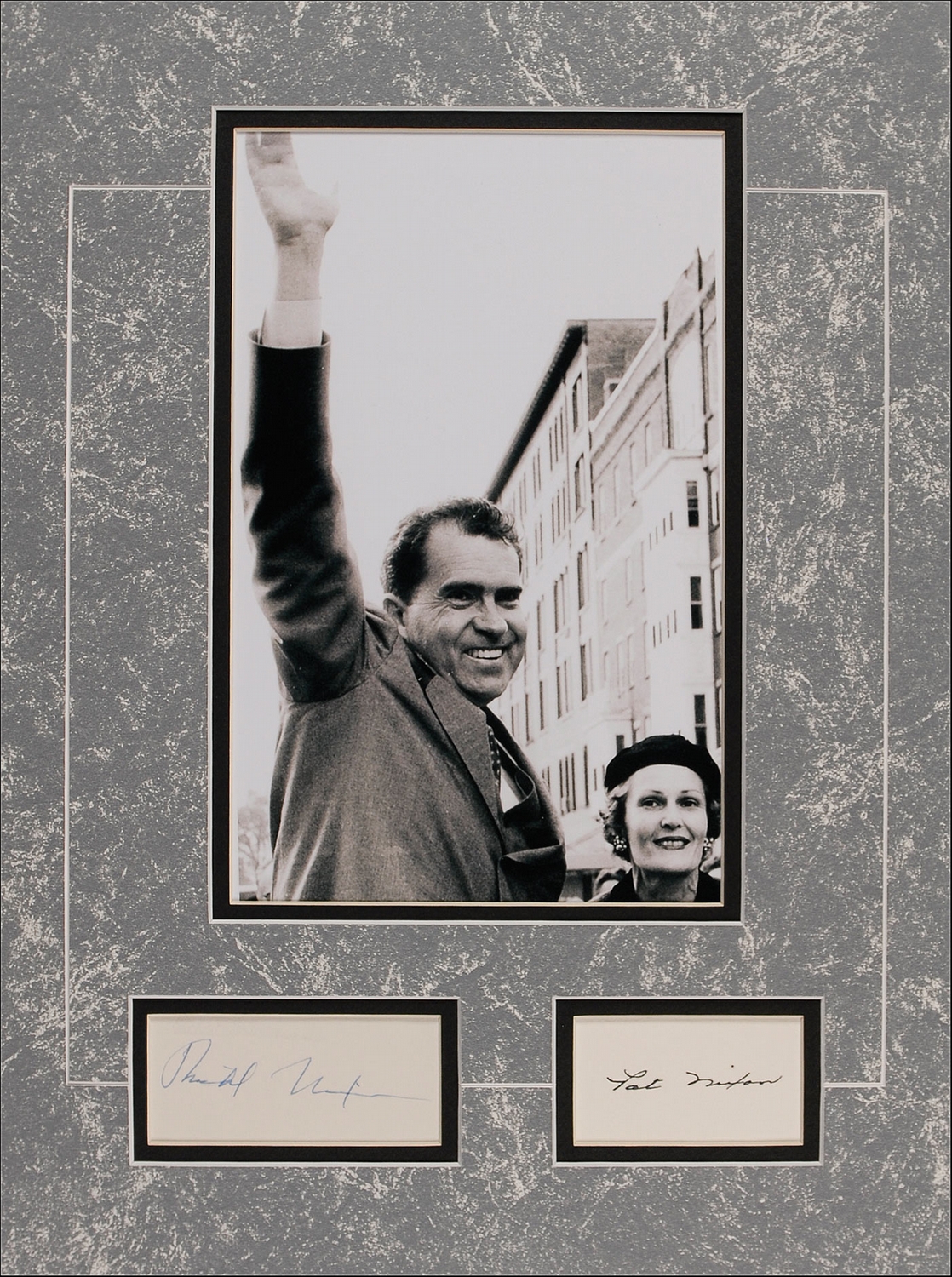 Ink signature, “Richard Nixon,” on an off-white card; and an ink signature, “Pat Nixon,” on an off-white slip. Both are double matted with a satin-finish photo of the couple to an overall size of 12 x 16. In fine condition.
