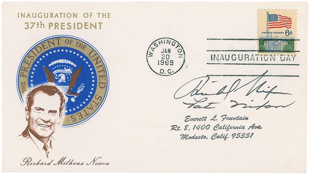 Inauguration Day cover with a cachet honoring Richard Nixon’s inauguration, signed in black ink, “Richard Nixon,” and “Pat Nixon.” In fine condition, with a stamped address under signatures.