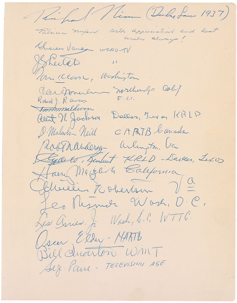 Ballpoint signatures, “Richard Nixon (Duke Law 1937)” and “Patricia Nixon, with appreciation and best wishes always!” on an off-white 9.5 x 12 guest book page, also signed in blue ballpoint on both sides by 30 others, including Tom C. Clark. In fine condition, with some light edge creases.