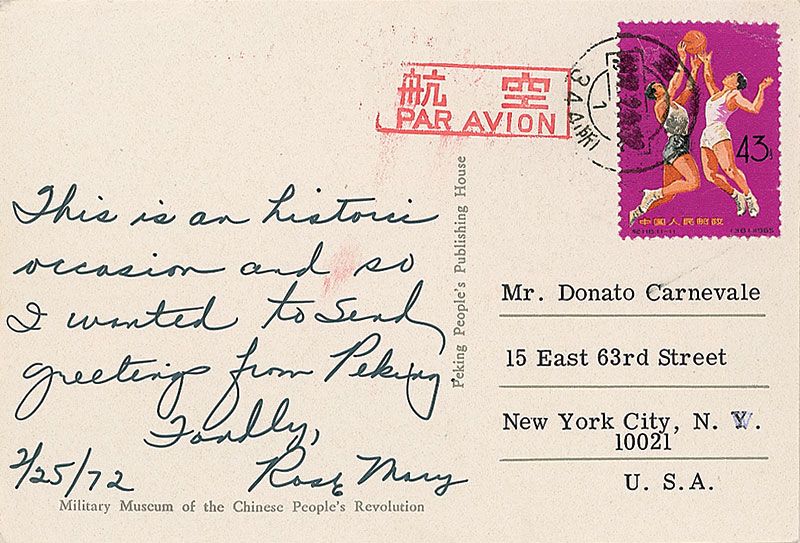 ALS signed “Pat,” and “RN,” on a color 5.75 x 3.75 postcard, Peking, China, postmarked February 25, 1972. Postcard to Don Carnevale, written by Pat. In full: “This card comes from us as a momento [sic] of an historical trip. Our love as always.” Signed at the conclusion by Richard and Pat Nixon. In fine condition. Postcard bears a stamp that honors the 1971 Afro-Asian Table Tennis Games. Accompanied by an ALS of Rose Mary Woods to Carnevale on a similarly postmarked picture postcard from Peking. During the week of February 21–28, 1972, Nixon became the first US president to visit China. On February 25, 1972, the day these two postcards were mailed, Nixon spent his last full day in Peking beginning with a tour of the Forbidden City.