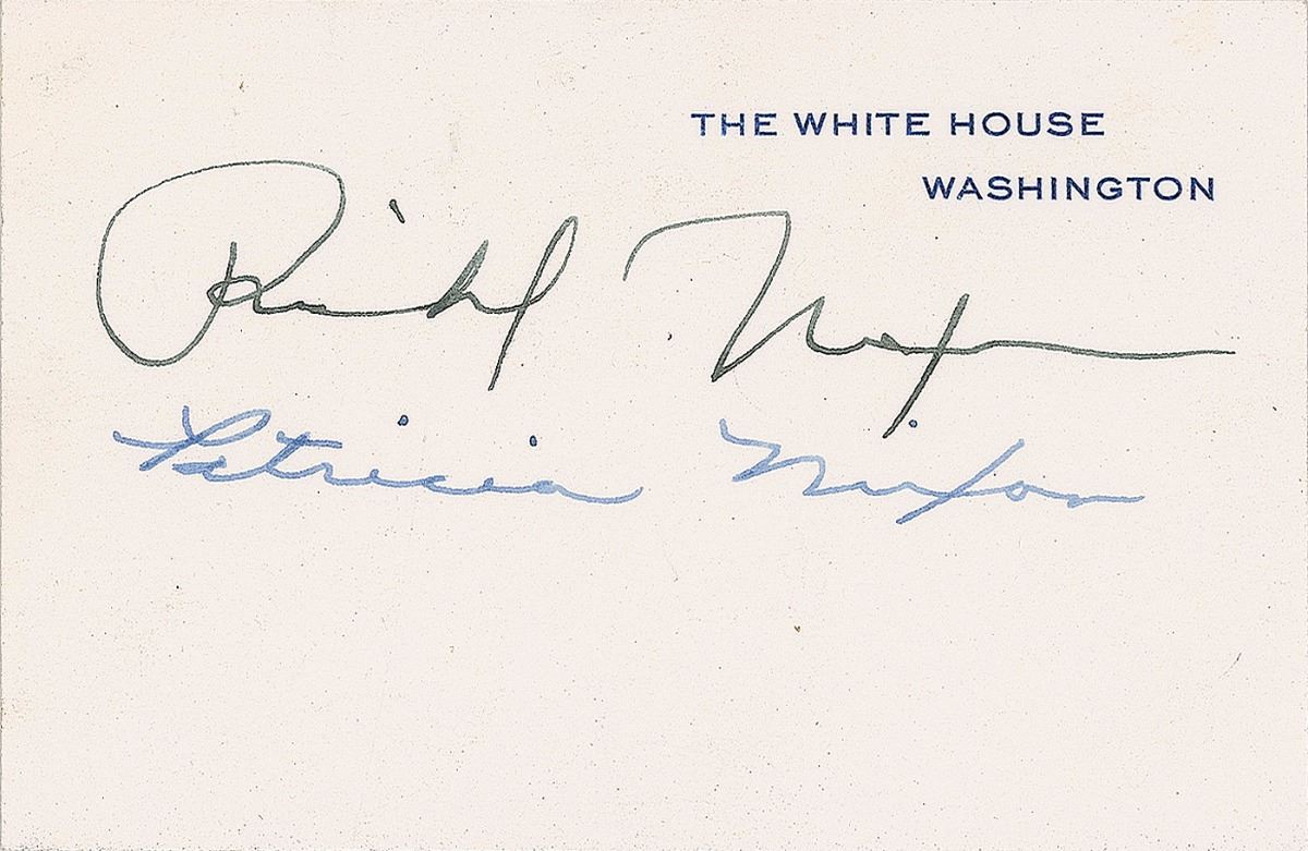 Uncommon White House card, signed in black ink, “Richard Nixon,” and in blue ink, “Patricia Nixon.” In fine condition.