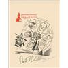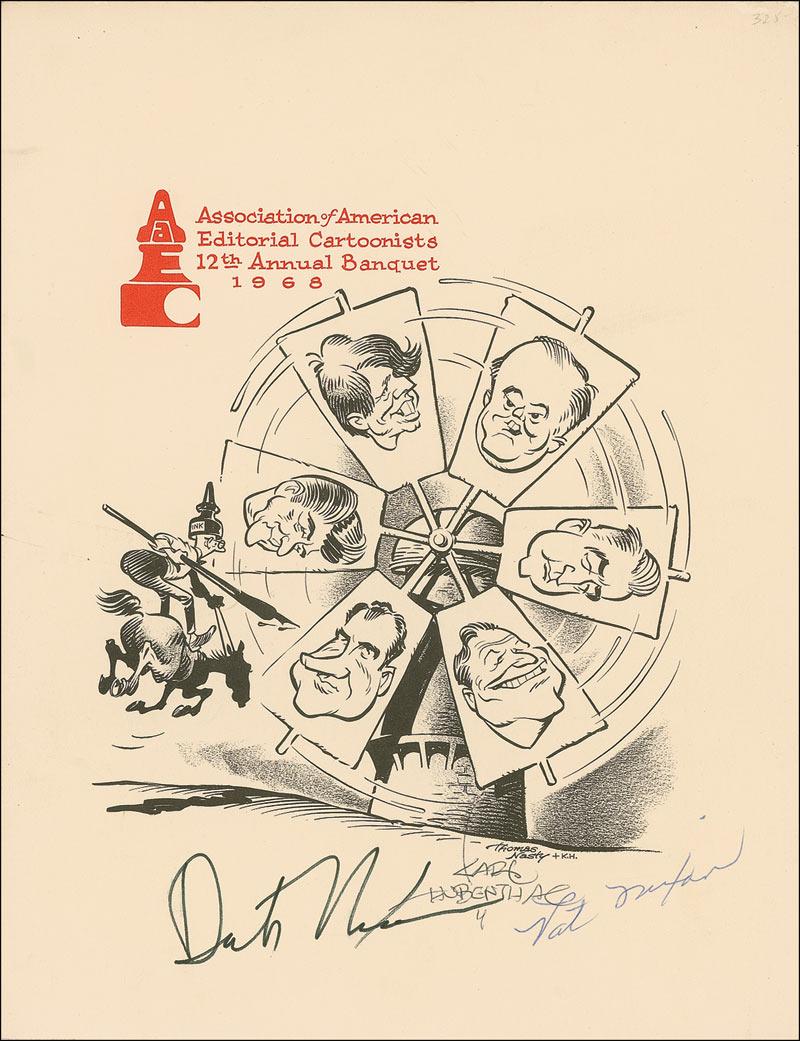 Menu for the 1968 Association of American Editorial Cartoonists 12th Annual Banquet, 8.5 x 13, signed on the front cover in black felt tip, “Dick Nixon” and in blue ballpoint, “Pat Nixon.” Also signed in black ink by editorial cartoonist Karl Hubenthal. The cover features caricatures of six political figures, including Nixon, who was guest speaker at the event. In fine condition, with light creasing and wear to the upper right corner.