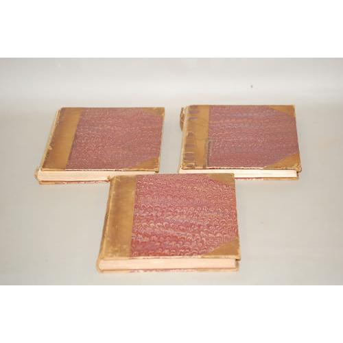 Richards, Walter. Her Majesty's Army - A Descriptive Account of the Various Regiments Now Comprising the Queen's Forces, From Their First Establishment to the Present Time - 3 Volumes. New York: John Beacham, 4to - over 9¾" - 12" tall. Hard Cover. Fair to Good condition. Circa 1890. WITH BOOKPLATE OF OTIS E. WELD, inside each cover. With 29 chromolithograph plates and an additional chromolithograph title. Bound in 3/4 leather & marbled paper, marbled endpapers, top edges gilt, binding tight. Two volumes lacking backstrips with covers detached.