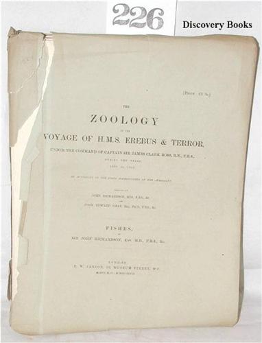 Richardson, John. ICHTHYOLOGY OF THE VOYAGE OF THE VOYAGE OF H.M.S. EREBUS & TERROR, UNDER THE COMMAND OF SIR JAMES CLARK ROSS R.N., F.R.S. London: 1844-1848 (on verso of title: Printed by Edward Newman). viii,140pp. Sixty uncolored plates. Unbound, uncut & partially unopened, laid in original printed wrapper. The wrapper (with the E. W. Janson imprint on front) separated along spine, chipped, with several folds, but both back & front mostly complete. Text & plates very good.