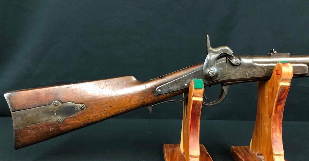 For sale in this lot is an antique, black powder, Richardson Overman Civil War carbine. The bore is strong with good rifling. Manufactured by Richardson & Overman of Philadelphia, this carbine fired an unprimed .50 caliber cartridge with a brass foil and paper-wrapped case or an all-brass case. When the trigger guard lever is lowered, the barrel slides out from the frame and tips downward to receive the cartridge. Around 23,000 of these were made. Unique! MAKER: Richardson Overman. Serial No. 14194. APPROX AGE: C. 1860s. SIZE: Barrel length is 22 inches. CONDITION: Pretty good for its age, wear expected. Appears to be all original parts. Please look closely at the pictures as they are an important part of our description and are hereby incorporated into the description, specifically with regards to condition. SHIPPING: There will be a $15 handling / packaging fee for shipping this lot. The actual cost of postage will be added on top of that. BUY IT NOW: If you would like to buy this item now, without waiting for the auction day to bid on it, we do offer this option (which is available up to 48 hours before the actual auction starts). The “Buy it Now” price is the high estimate of this lot (plus applicable fees and the Buyer's premium is discounted to 10% when using the Buy it Now option). If you would like to exercise this option, you must contact us by email (or phone as long as you talk to someone live). Reference this lot number and your intention to "Buy it Now." *****BLACK POWDER - DOES NOT REQUIRE an FFL Transfer*****