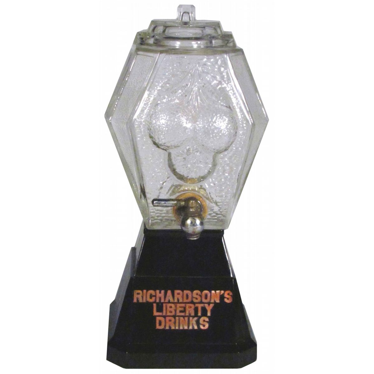 Richardson's Liberty Drinks Syrup Dispenser. Crack at top of reservoir, not clear thru and tiny chip inside lid. 14 inches tall.