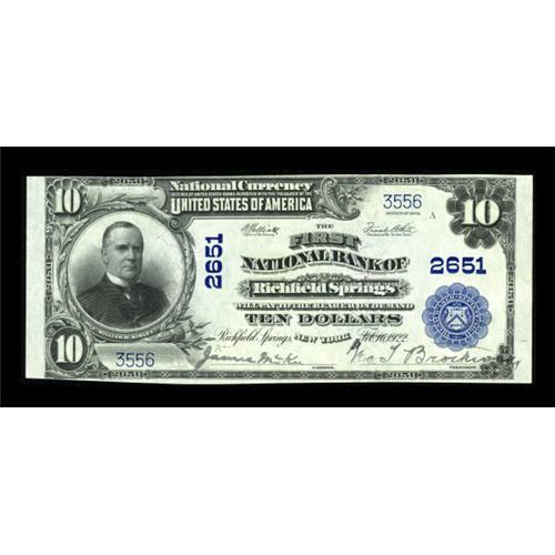 <B>Richfield Springs, NY</B></I> - $10 1902 Plain Back Fr. 634 <B>The First NB</B></I> Ch. # 2651<BR> Newly discovered and, by a very considerable margin of two grades or more, the finest large note known from this one bank Otsego County location. Bright <B>About Uncirculated,</B></I> a fully original piece worthy of the finest of collections. <BR><BR><b>Shipping:</b> Coins & Currency (<a target="_blank" href="http://www.heritageauctions.com/common/shipping.php">view shipping information</a>)