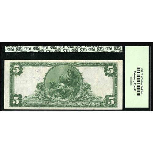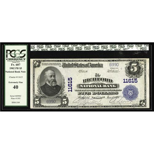 <B>Richford, VT</B></I> - $5 1902 Plain Back Fr. 607 <B>The Richford NB</B></I> Ch. # 11615<BR>This institution was chartered in 1920 and issued both large and small size notes. A miniscule $1050 was left outstanding in 1935 allowing for this new addition to present itself. It is quite bright with pleasing margins. <B>PCGS Extremely Fine 40.</B></I>