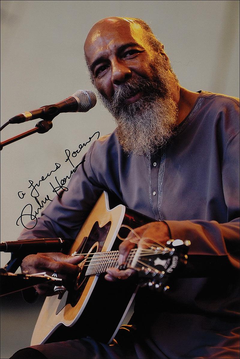 Color satin-finish 12 x 18 photo of Havens and his guitar, signed in black felt tip, “A friend forever, Richie Havens.” In very fine condition.