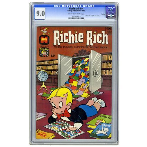 <B>Richie Rich #14 File Copy (Harvey, 1962) CGC VF/NM 9.0 Cream to off-white pages.</B></I> Richie's comic book collection seen on cover. Little Dot and Little Lotta also appear. Overstreet 2006 VF/NM 9.0 value = $175; NM- 9.2 value = $240. CGC census 2/06: 1 in 9.0, 1 higher.