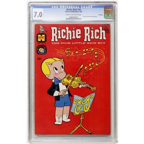 <B>Richie Rich #18 File Copy (Harvey, 1963) CGC FN/VF 7.0 Cream to off-white pages.</B></I> Little Dot and Little Lotta stories. Overstreet 2007 FN 6.0 value = $48; VF 8.0 value = $112. CGC census 10/07: 1 in 7.0, 7 higher.<BR><BR><b>Shipping:</b> Comics - Slabbed (certified) (<a target="_blank" href="http://www.heritageauctions.com/common/shipping.php">view shipping information</a>)