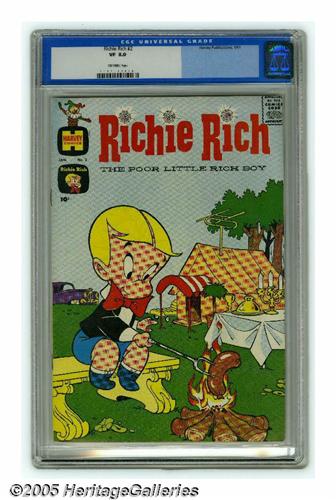 <B>Richie Rich #2 (Harvey, 1961) CGC VF 8.0 Off-white pages.</B></I> Believe it or not, there was a time when Richie Rich had just one comic book named after him, and this is the second issue of that series. Warren Kremer provided a cute cover for the issue... we'd be avid outdoorsmen too, if we could just "rough it" Richie-style! Overstreet 2005 VF 8.0 value = $434. CGC census 7/05: 1 in 8.0, 5 higher.