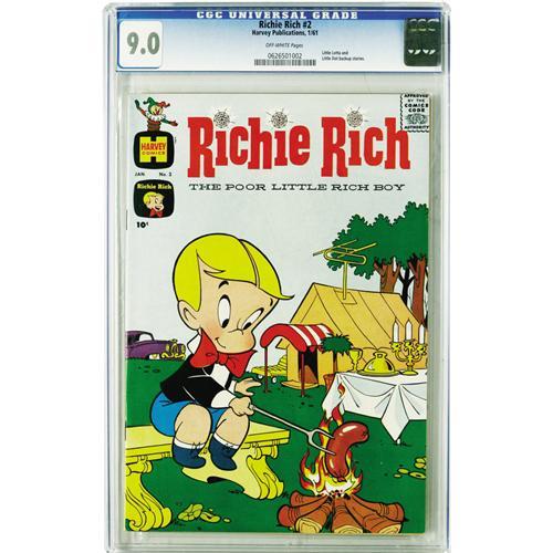 <B>Richie Rich #2 (Harvey, 1961) CGC VF/NM 9.0 Off-white pages.</B></I> Richie "roughs it" in the usual Rich family style -- complete with a gold-plated bench to sit on while roasting wienies! Those Harvey gals, Little Lotta and Little Dot, also appear inside this tough-to-find second issue. Overstreet 2006 VF/NM 9.0 value = $784; NM- 9.2 value = $1,100. CGC census 4/06: 1 in 9.0, 4 higher.
