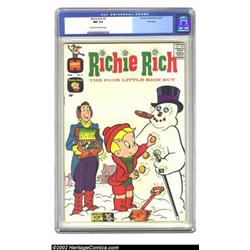 Richie Rich #3 File copy (Harvey, 1961) CGC NM 9.4 Cream to off-white pages. Richie Rich builds a snowman just like we all did as kids. This is the third issue of Richie Rich's eponymous title, one of the great titles in the history of American humor comics. This particular copy was saved by the title's editor as part of his personal reference file, and we are pleased to offer a very small, select set of issues starring Richie Rich. The personal file copies of the editor have fresher paper than the other Harvey file copies that were stored in an unairconditioned warehouse. Richie Rich has not only grown to become an American icon, but, at one time, was featured on as many as 35 concurrently-published titles, more than any other comic character ever. According to the CGC census this is the highest-graded copy, and is quite possibly the best copy in existence. Overstreet 2002 NM 9.4 value = $375. Important notice: We expect to be auctioning lots at the rate of 200-250 per hour. Sometimes eBay Premier live bid software cannot keep up with that pace, so we strongly recommend that you place a realistic proxy bid now as insurance to avoid disappointment. Also please note that all Heritage/CAA lots purchased through eBay Premier carry a 20% Buyer's Premium. Please make sure you read the Terms and Conditions.