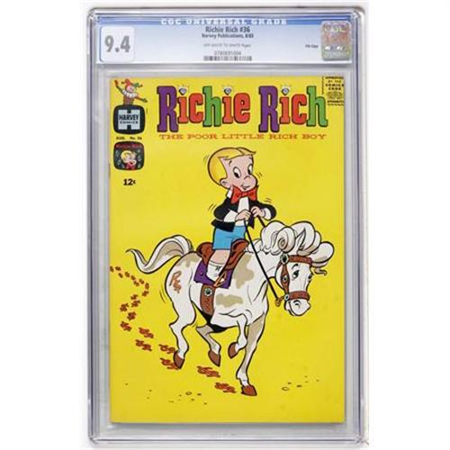 <B>Richie Rich #36 File Copy (Harvey, 1965) CGC NM 9.4 Off-white to white pages.</B></I> Overstreet 2007 NM- 9.2 value = $140. CGC census 12/07: 2 in 9.4, none higher.<BR><BR><b>Shipping:</b> Comics - Slabbed (certified) (<a target="_blank" href="http://www.heritageauctions.com/common/shipping.php">view shipping information</a>)