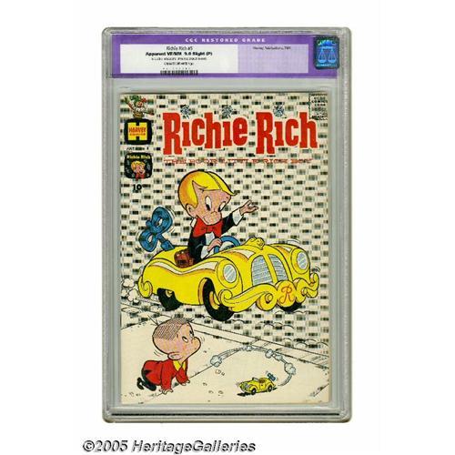 <B>Richie Rich #5 (Harvey, 1961) CGC Apparent VF/NM 9.0 Slight (P) Cream to off-white pages.</B></I> Richie shows off his latest toy on the cover to this early issue. CGC notes, ""Restoration includes: small amount of color touch on cover."" Overstreet 2005 GD 2.0 value = $34; VG 4.0 value = $68; FN 6.0 value = $102; VF 8.0 value = $255; VF/NM 9.0 value = $403; NM- 9.2 value = $550. <BR><BR><B>Important notice:</B> Heritage usually auctions material at the rate of 200-250 lots per hour. On some occasions eBay Live bid software or the Internet may not be able to keep up with the pace of the auction. We recommend placing a realistic absentee bid now as insurance to avoid disappointment. Occasionally the auctioneer may eliminate or reject an eBay Live bid, and the auctioneer may also reopen a lot after the close of the eBay live bidding (usually because we missed an audience bid), and may reject your bid even if it shows you as the winning bidder. By bidding via eBay Live, you agree that Heritage may award the lot to another bidder at its sole discretion under the circumstances described above or any other reasonable circumstances. Since eBay bids are not shown to us until we open the lot on the floor, we treat those bids just like floor bids. In most cases the floor responds before the eBay bid is presented to us, due to Internet lag time, so for consistency we have made it a policy that floor bids are always considered first over tie eBay live bids. Also please note that all Heritage lots purchased through eBay Live carry a 20% Buyer's Premium. Please make sure you read the Terms and Conditions before you bid. This lot is being auctioned in conjunction with a live floor auction by Heritage Galleries & Auctioneers. All final auction and invoice information will be supplied by Heritage Galleries & Auctioneers, and all other information should be considered preliminary. Lot:1467 <BR><BR><B>Winning Notification and Billing:</B> After the FINAL session in this auction is
