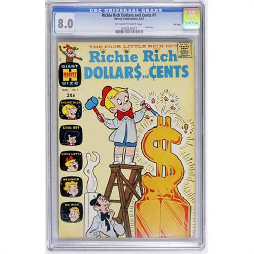 <B>Richie Rich Dollars and Cents #1 File Copy (Harvey, 1963) CGC VF 8.0 Off-white to white pages.</B></I> Overstreet 2007 VF 8.0 value = $126. CGC census 9/07: 1 in 8.0, 6 higher.<BR><BR><b>Shipping:</b> Comics - Slabbed (certified) (<a target="_blank" href="http://www.heritageauctions.com/common/shipping.php">view shipping information</a>)
