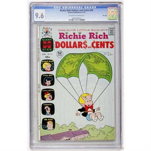 <B>Richie Rich Dollars and Cents #55 File Copy (Harvey, 1973) CGC NM+ 9.6 Off-white to white pages.</B></I> 52 pages. The only copy of this issue certified by CGC to date. Overstreet 2007 NM- 9.2 value = $18. CGC census 1/08: 1 in 9.6, none higher.<BR><BR><b>Shipping:</b> Comics - Slabbed (certified) (<a target="_blank" href="http://www.heritageauctions.com/common/shipping.php">view shipping information</a>)