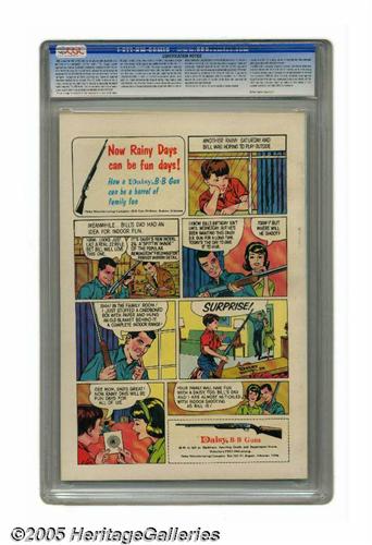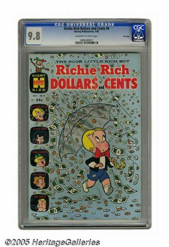 <B>Richie Rich Dollars and Cents #9 File Copy (Harvey, 1965) CGC NM/MT 9.8 Off-white to white pages.</B></I> We used to think "high-grade Richie Rich" was almost a contradiction in terms, as these comics were usually read and enjoyed by younger kids, not stored by grownups. Of course, that explains why the File Copies that we've offered in the past have prompted spirited bidding wars, even for books that didn't have this one's lofty grade of 9.8. By all means, ring for your butler and have him put in an aggressive bid on this one. Overstreet 2005 NM- 9.2 value = $60. CGC census 4/05: 3 in 9.8, none higher.