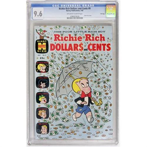 <B>Richie Rich Dollars and Cents #9 File Copy (Harvey, 1965) CGC NM+ 9.6 Off-white to white pages.</B></I> Giant-size issue. Overstreet 2007 NM- 9.2 value = $95. CGC census 9/07: 1 in 9.6, 3 higher.<BR><BR><b>Shipping:</b> Comics - Slabbed (certified) (<a target="_blank" href="http://www.heritageauctions.com/common/shipping.php">view shipping information</a>)