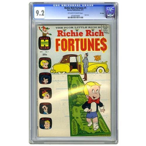 <B>Richie Rich Fortunes #1 File Copy (Harvey, 1971) CGC NM- 9.2 Off-white to white pages.</B></I> Giant-size issue. Note that a small plastic stabilizing peg is loose inside the CGC holder, not affecting the comic itself or the integrity of the holder. Overstreet 2006 NM- 9.2 value = $75. CGC census 2/06: 1 in 9.2, 5 higher.