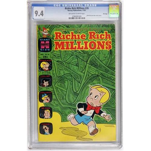 <B>Richie Rich Millions #26 File Copy (Harvey, 1967) CGC NM+ 9.6 Off-white to white pages.</B></I> Little Dot and Little Lotta stories. Overstreet 2007 NM- 9.2 value = $55. CGC census 10/07: 1 in 9.4, 1 higher.<BR><BR><b>Shipping:</b> Comics - Slabbed (certified) (<a target="_blank" href="http://www.heritageauctions.com/common/shipping.php">view shipping information</a>)