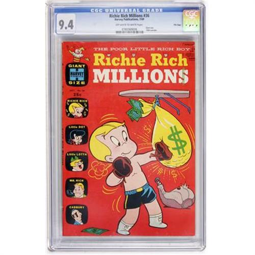 <B>Richie Rich Millions #36 File Copy (Harvey, 1969) CGC NM 9.4 Off-white to white pages.</B></I> Giant size issue. Contains a 1969 calendar. Overstreet 2007 NM- 9.2 value = $40. CGC census 12/07: 3 in 9.4, 1 higher.<BR><BR><b>Shipping:</b> Comics - Slabbed (certified) (<a target="_blank" href="http://www.heritageauctions.com/common/shipping.php">view shipping information</a>)