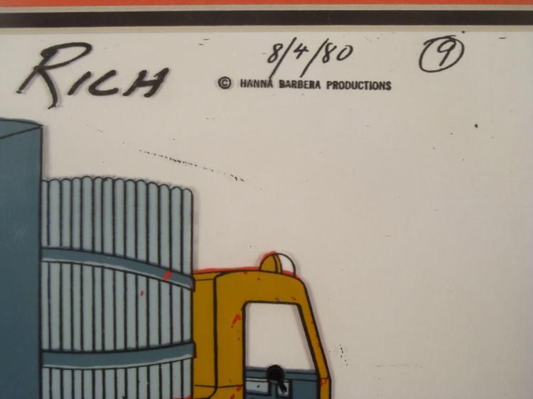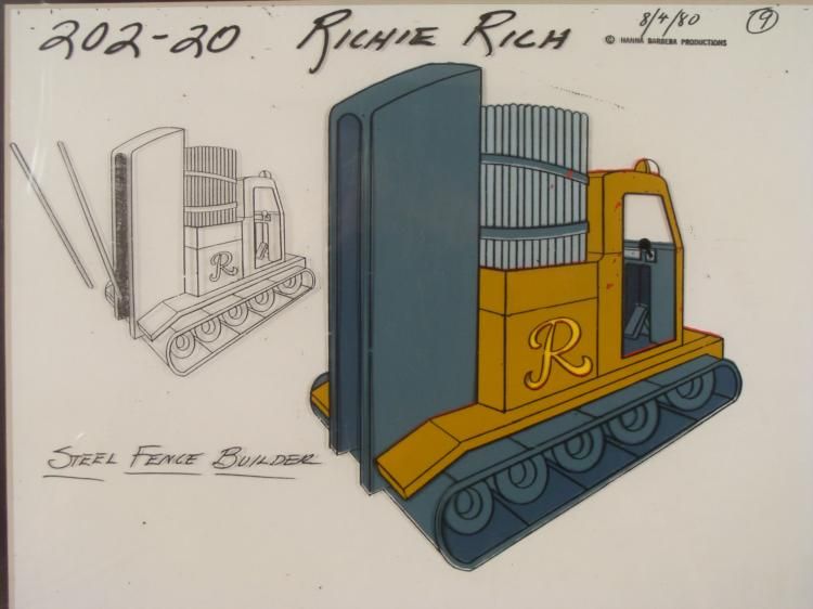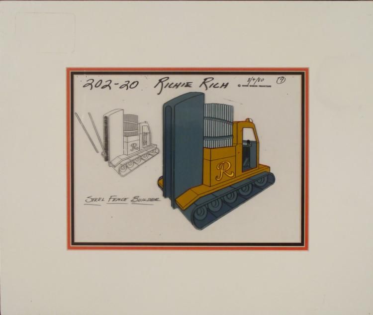 This is an original animation model cel used in the production of the 1980 cartoon Richie Rich. This cel was made for the animator's so they would know exactly how to draw this vehicle called the steel fence builder. * Medium: Hand-inked and hand-painted acetate cellDetails: Hanna Barbera copyright stamp, dated 8/4/80Image size: 11 1/2 x 8 1/2 inchesPresentation: Triple matted in red, black and whiteMatte size: 19 x 16 inchesCondition: Excellent; sealed in cellophane