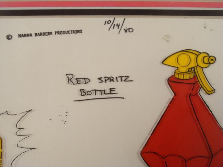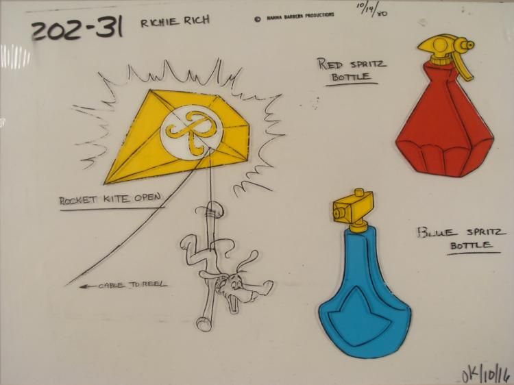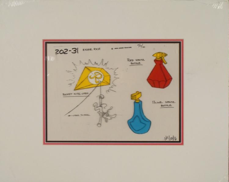 Here is an original animation model cel used in the production of the 1980 cartoon Richie Rich. This cel was made for the animator's so they would know exactly how to draw some of the props, including an impressive Rocket Kite. * Medium: Hand-inked and hand-painted acetate cellDetails: Hanna Barbera copyright stamp, dated 10/14/80, okayed 10/16Image size: 11 1/2 x 8 1/2 inchesPresentation: Triple matted in red, black and whiteMatte size: 20 x 16 inchesCondition: Excellent; sealed in cellophane