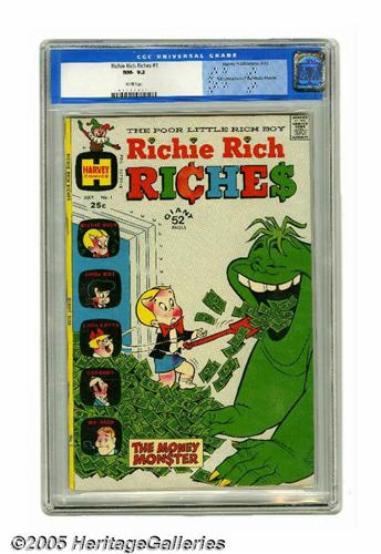 <B>Richie Rich Riches #1 (Harvey, 1972) CGC NM- 9.2 White pages.</B></I> First appearance of the Money Monster. Overstreet 2005 NM- 9.2 value = $75. CGC census 6/05: 2 in 9.2, 3 higher.