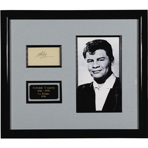 <B>Richie Valens Autograph Display.</B></I> A sample of Valens' signature in pencil, matted and framed along with a b&w 5" x 8" photo photo of the singer and small plaque, to an overall size of 16" x 14". Valens' bright career and tragic, untimely death make his signature rare and much desired. In Excellent condition. <I>Accompanied by LOA from PSA/DNA.</B></I>