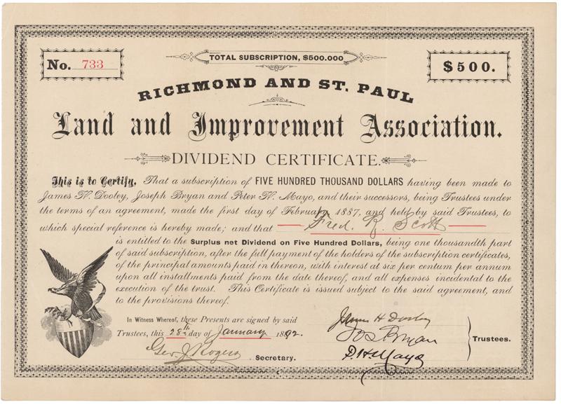 1892, Virginia. Dividend certificate for five hundred thousand dollars. Black / White. Vignette of an eagle with an American flag themed shield grasped in its talons at lower left. Signed, “James H. Dooley,” as trustee by JAMES H. DOOLEY (1841-1922) Virginia lawyer, business leader and philanthropist during the Reconstruction period and the Gilded Age. Slight fold at upper left corner. Overall Very Fine.