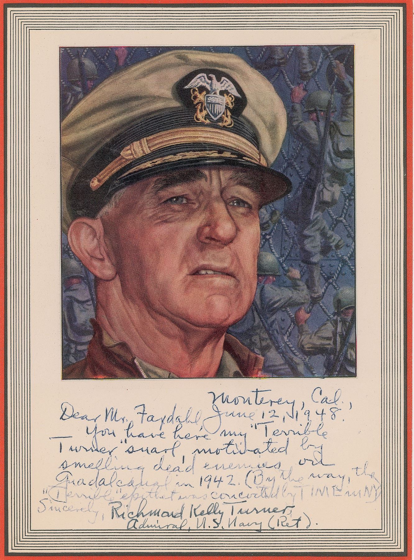Color 5.25 x 6 photo cut from the cover of Time Magazine and applied to a 7.25 x 10.25 card, signed and inscribed in blue ballpoint, "Dear Mr. Faxdahl, June 12, 1948, You have here my 'Terrible Turner' snarl, motivated by smelling dead enemies on Guadalcanal in 1942 (By the way, the 'Terrible' epithet was concocted by TIME in NY), Sincerely, Ricmond Kelly Turner, Admiral, U.S. Navy (Ret.).” In fine condition.