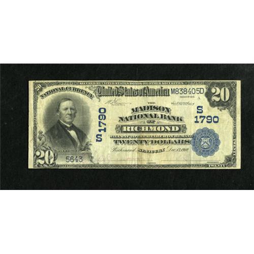 <B>Richmond, KY</B></I> - $20 1902 Plain Back Fr. 653 <B>The Madison NB</B></I> Ch. # (S)1790<BR> A pleasing and problem free <B>Fine. </B></I>Surprisingly, only eight large size pieces are known with this first title.<BR><BR><b>Shipping:</b> Coins & Currency (<a target="_blank" href="http://www.heritageauctions.com/common/shipping.php">view shipping information</a>)