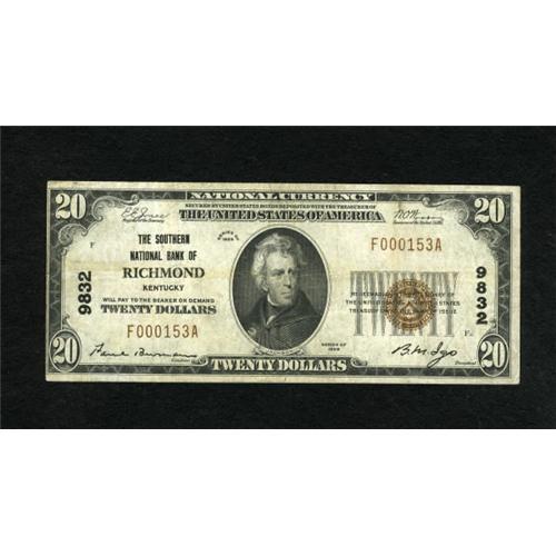 <B>Richmond, KY</B></I> - $20 1929 Ty. 1 <B>The Southern NB</B></I> Ch. # 9832<BR> This rare institution has only eight 1929 notes listed in the census. This example is a solid <B>Fine-Very Fine,</B></I> problem free, but for a close margin at left. Officers are Paul Burnam and B.M. Igo.<BR><BR><b>Shipping:</b> Coins & Currency (<a target="_blank" href="http://www.heritageauctions.com/common/shipping.php">view shipping information</a>)