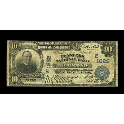 <B>Richmond, VA</B></I> - $10 1902 Date Back Fr. 617 <B>The Planters NB</B></I> Ch. # (S)1628<BR>A scarcer Richmond bank which issued large notes only. <B>Very Good,</B></I> with clear signatures.