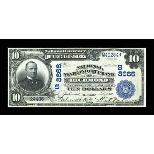 <B>Richmond, VA</B></I> - $10 1902 Date Back Fr. 619 <B>National State Bank</B></I> Ch. # (S)8666<BR> A corner tip fold accounts for the grade on this <B>About Uncirculated </B></I>piece. The last piece to hold a candle to this note in condition was an AU that sold in our September 2006 auction for a touch over $1000.<BR><BR><b>Shipping:</b> Coins & Currency (<a target="_blank" href="http://www.heritageauctions.com/common/shipping.php">view shipping information</a>)