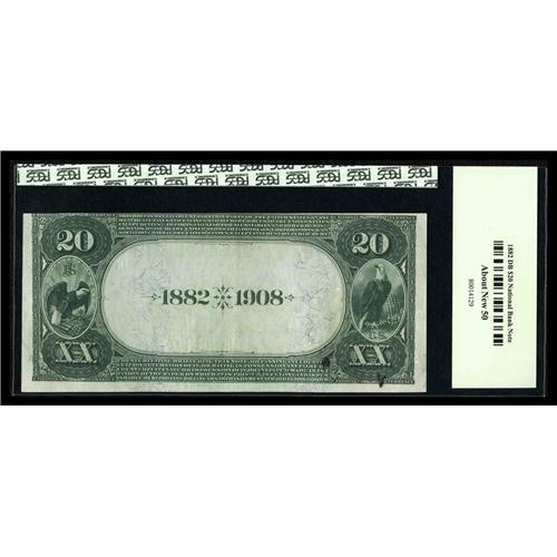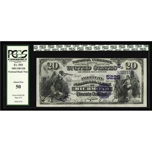<B>Richmond, VA</B></I> - $20 1882 Date Back Fr. 555 <B>The American NB</B></I> Ch. # (S)5229<BR>Three mammoth margins and faint handling are traits of this $20 with rubber stamped signatures of Hill and Sands who managed this bank for many years. <B>PCGS About New 50.</B></I>