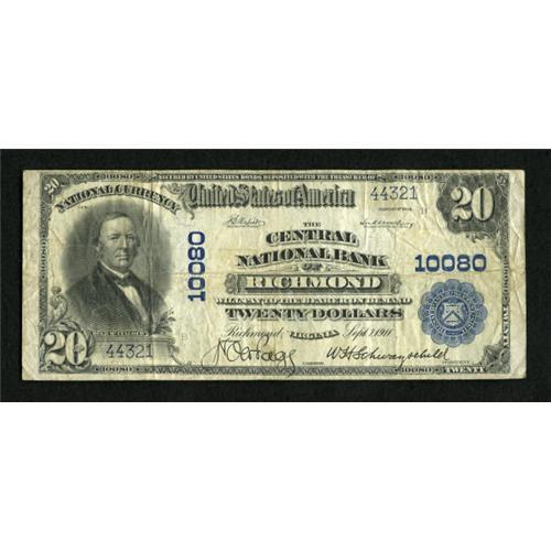 <B>Richmond, VA</B></I> - $20 1902 Plain Back Fr. 654 <B>The Central NB</B></I> Ch. # 10080<BR> Plate engraved signatures are noted on this wholly original and problem free issue. <B>Fine-Very Fine.</B></I><BR><I>From The John Ameen Collection</B></I><BR><BR><b>Shipping:</b> Coins & Currency (<a target="_blank" href="http://www.heritageauctions.com/common/shipping.php">view shipping information</a>)
